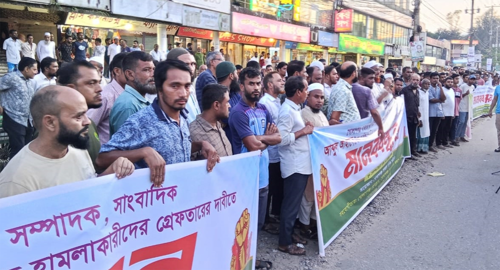 সিলেটের গোলাপগঞ্জে বাজার বণিক সমিতির সাধারণ সম্পাদক, সাংবাদিক আব্দুল আহাদের উপর সন্ত্রাসী হামলার প্রতিবাদে ও আসামিদের গ্রেপ্তারের দাবিতে মানববন্ধন অনুষ্ঠিত হয়েছে।