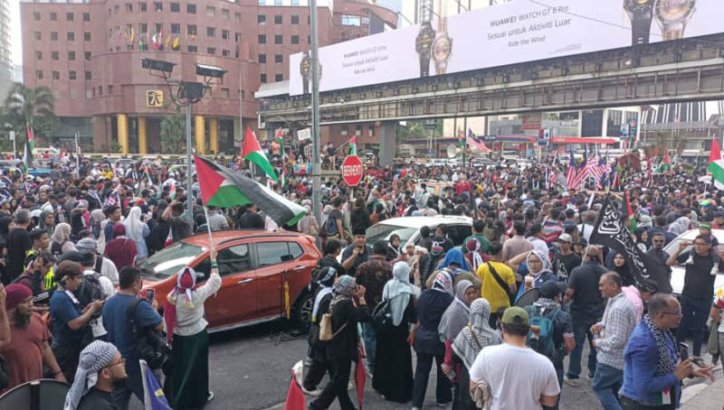মালয়েশিয়া প্রতিনিধি: কুয়ালালামপুরে শুক্রবার সকাল থেকেই টানা বৃষ্টি চললেও তা আটকাতে পারেনি ইসরায়েল-বিরোধী সমাবেশে অংশ নেওয়া হাজারো মানুষকে। জুমআ’র নামাজ শেষে রাজধানীর তাবুং হাজি ভবনের সামনে বিশিষ্ট বক্তাদের বক্তব্যের পর জনতা মার্কিন দূতাবাসের দিকে মিছিল করে। স্লোগানে মুখরিত এই মিছিল গাজার মানুষের প্রতি সংহতি প্রকাশ করে এবং ইসরায়েলের আগ্রাসনের তীব্র নিন্দা জানায়।
