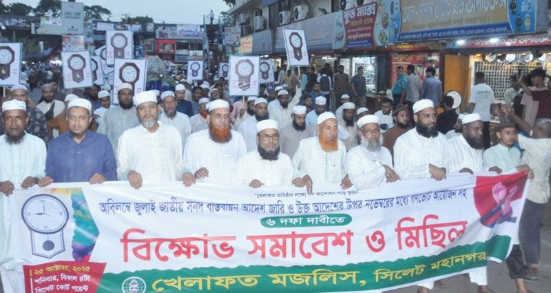 তিনি শনিবার নগরীর কোর্ট পয়েন্টে আয়োজিত বিক্ষোভ সমাবেশে সভাপতির বক্তব্যে উপরোক্ত কথাগুলো বলেন।জুলাই জাতীয় সনদ বাস্তবায়নে সরকারী আদেশ জারি এবং এর উপর নভেম্বরের মধ্যে গণভোট প্রদানসহ ৬ দফা দাবিতে কেন্দ্র ঘোষিত বিক্ষোভ কর্মসূচির অংশ হিসেবে বিকাল ৪টায় খেলাফত মজলিস সিলেট মহানগর শাখার উদ্যোগে সিলেটের কোর্ট পয়েন্টে বিশাল বিক্ষোভ সমাবেশ অনুষ্ঠিত হয়।