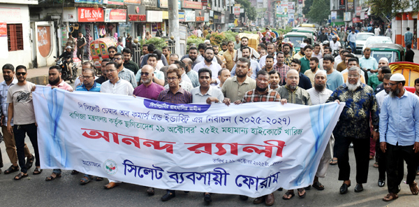 সিলেট চেম্বার অব কমার্স এন্ড ইন্ডাস্ট্রির নির্বাচন (২০২৫-২০২৭) নিয়ে বাণিজ্য মন্ত্রণালয়ের স্থগিতাদেশ হাইকোর্ট কর্তৃক খারিজ হওয়ায় নগরীতে আনন্দ র্যালী করেছে সিলেট ব্যবসায়ী ফোরাম। বুধবার (২৯ অক্টোবর) দুপুরে নগরীর বারুতখানা পয়েন্ট থেকে আনন্দ র্যালিটি শুরু হয়ে নগরীর প্রধান প্রধান সড়ক প্রদক্ষিণ শেষে কেন্দ্রীয় শহীদ মিনারে গিয়ে সংক্ষিপ্ত সমাবেশের মধ্যে দিয়ে সমাপ্ত হয়।