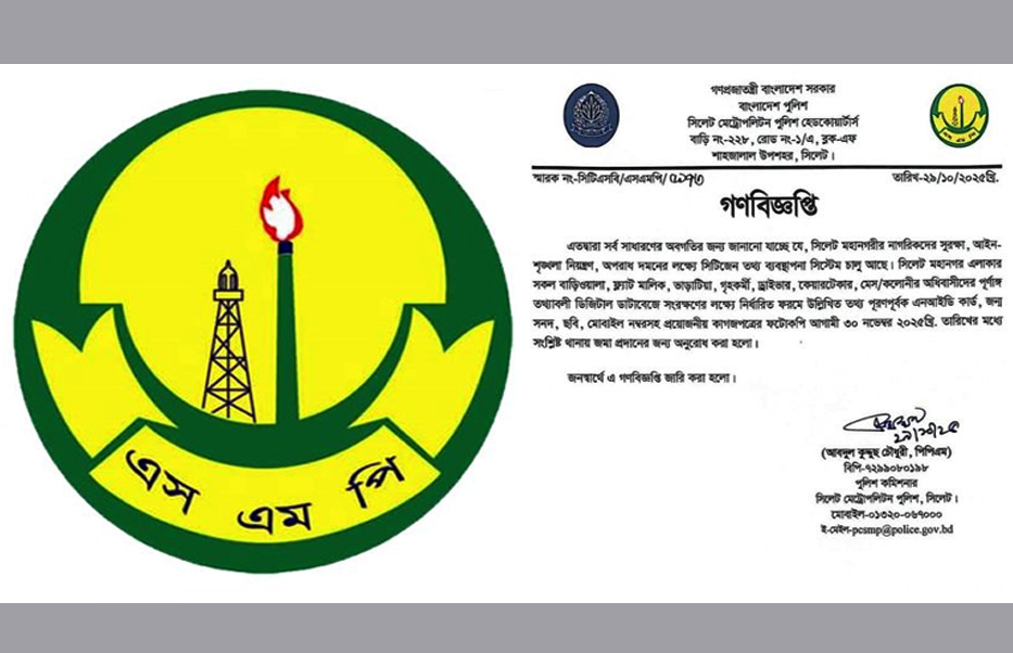 গণবিজ্ঞপ্তিতে জানানো হয়- নাগরিক সুরক্ষা, আইনশৃঙ্খলা রক্ষা ও অপরাধ দমনের লক্ষ্যে সিলেট মহানগর পুলিশ (এসএমপি) সিটিজেন ইনফরমেশন ম্যানেজমেন্ট সিস্টেম চালু করা হয়েছে। এই ব্যবস্থার মাধ্যমে মহানগর এলাকার বাড়িওয়ালা, ভাড়াটিয়া, গৃহকর্মী, ড্রাইভার, কেয়ারটেকার এবং মেস বা কলোনির বাসিন্দাদের পূর্ণাঙ্গ তথ্য ডিজিটাল ডাটাবেজে সংরক্ষণ করা হবে। তাই আগামী ৩০ নভেম্বরের মধ্যে সিলেট মহানগরীর সকল নাগরিককে নির্ধারিত ফরমে প্রয়োজনীয় তথ্য পূরণ করে জাতীয় পরিচয়পত্র (এনআইডি), জন্মসনদ, ছবি, মোবাইল নম্বরসহ প্রয়োজনীয় কাগজপত্রের ফটোকপি সংশ্লিষ্ট থানায় জমা দেওয়ার আহবান জানানো হয়।
