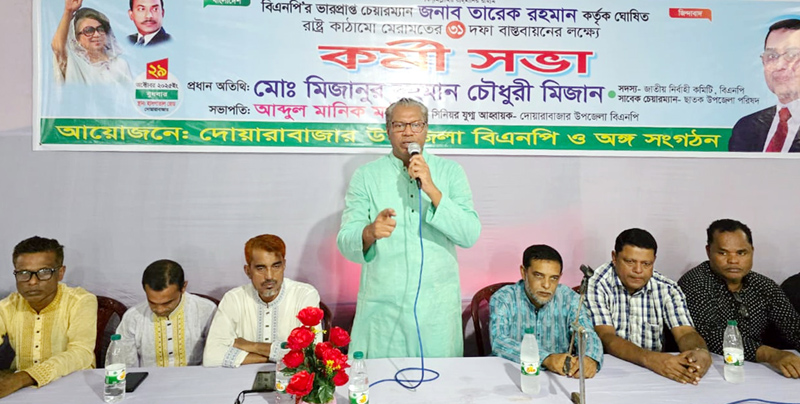 বিএনপির জাতীয় নির্বাহী কমিটির সদস্য ও ছাতক উপজেলা পরিষদের সাবেক চেয়ারম্যান মোঃ মিজানুর রহমান চৌধুরী মিজান বলেছেন, দীর্ঘ ফ্যাসিবাদী শাসনে পুরো রাষ্ট্রযন্ত্রকে ধ্বংস করে দেয়া হয়েছে। মানুষের ভোটাধিকার কেড়ে নিয়ে গণতন্ত্রকে গলাটিপে হত্যা করা হয়েছে। পতিত আওয়ামী শাসনে বিধ্বস্ত গণতন্ত্র পুনঃপ্রতিষ্ঠা ও আইনের শাসন প্রতিষ্ঠায় আগামী নির্বাচন দেশ ও জাতির জন্য অত্যন্ত গুরুত্বপূর্ণ। এই নির্বাচনে ধানের শীষকে বিজয়ী করতে হবে।