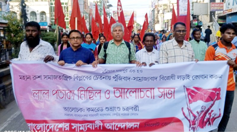 মহান রুশ বিপ্লবের ১০৮তম বার্ষিকী উপলক্ষে বাংলাদেশের সাম্যবাদী আন্দোলন সিলেট জেলার উদ্যোগে শুক্রবার বিকাল ৪ টায় সিলেট কেন্দ্রীয় মুসলিম সংসদের সাহিত্য আসরকক্ষে আলোচনা সভা অনুষ্ঠিত হয়। আলোচনা সভার পূর্বে লাল পতাকা মিছিল শহরের গুরুত্বপূর্ণ সড়ক প্রদক্ষিণ করে আলোচনা সভাস্থলে এসে শেষ হয়।
