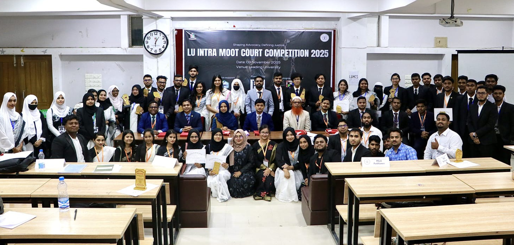 লিডিং ইউনিভার্সিটির আইন বিভাগ ও লিডিং ইউনিভার্সিটি মুট কোর্ট সোসাইটির আয়োজনে অনুষ্ঠিত হলো ‘এলইউ ইন্ট্রা মুট কোর্ট কম্পিটিশন-২০২৫’। প্রতিযোগিতায় ‘বোনা ফাইডি’, ‘অবজেকশন ওভার রুল্ড’, ‘আকাশিক রেকর্ডস’, ‘দ্যা ভার্ডিক্ট’, ‘বেয়ন্ড এ রিজোনেবল ফ্লেক্স’, ‘লেক্স ইনভিক্টা’, ‘হ্যাপিলি এভার আফটার’, ‘মুটিভ্যাশন’ শিরোনামে মোট ৮ টি মুটিং টিম অংশগ্রহণ করে, যেখানে শিক্ষার্থীরা তাদের আইনগত জ্ঞান, যুক্তি ও আদালত উপস্থাপনার দক্ষতা প্রদর্শন করেন।