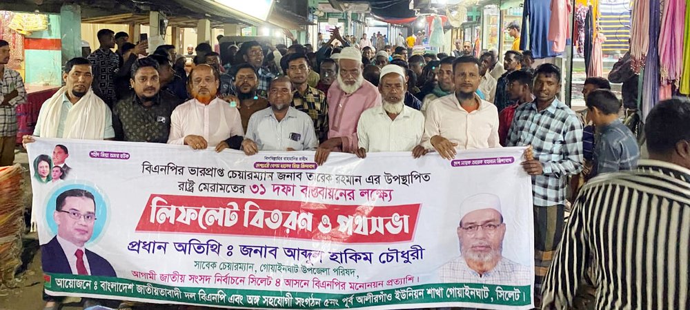 সিলেট জেলা বিএনপির উপদেষ্টা, সাবেক সহ-সভাপতি, গোয়াইনঘাট উপজেলা পরিষদের সাবেক চেয়ারম্যান ও সিলেট-৪ আসনে (গোয়াইনঘাট, জৈন্তাপুর ও কোম্পানীগঞ্জ) বিএনপির মনোনয়ন প্রত্যাশী আব্দুল হাকিম চৌধুরীর সমর্থনে বিশাল গণমিছিল করেছে গোয়াইনঘাট পূর্ব আলীরগাও ইউনিয়ন বিএনপি অঙ্গ-সংগঠন। রবিবার (১৬ নভেম্বর) সন্ধ্যা ৭ টায় স্থানীয় বারহাল বাজারে বিভিন্ন শ্রেণীপেশার মানুষের অংশগ্রহণে বিএনপির ৩১ দফা ও হাকিম চৌধুরীর সমর্থনে উক্ত গণমিছিল ও পথসভা অনুষ্ঠিত হয়।