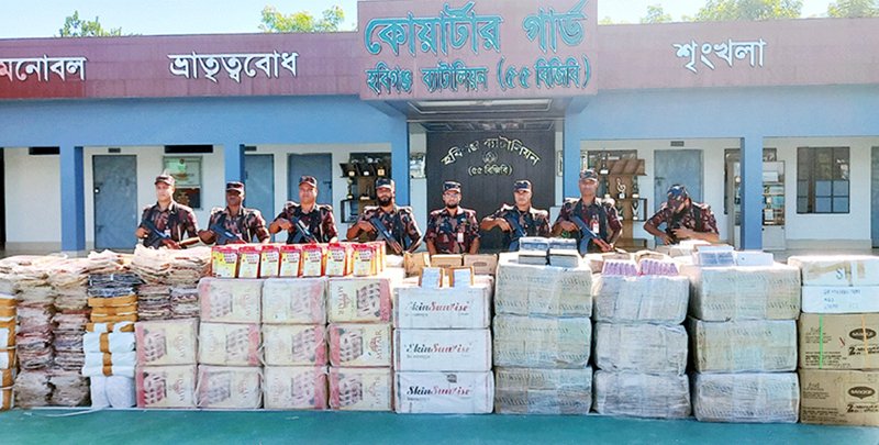 সোমবার (১৭ নভেম্বর) হবিগঞ্জ কার্যালয়ে এক প্রেস ব্রিফিংয়ে এর সত্যতা নিশ্চিত করেন হবিগঞ্জ ব্যাটালিয়ন ৫৫ বিজিবির অধিনায়ক লেফটেন্যান্ট কর্নেল মো. তানজিলুর রহমান।তিনি জানান, গোপন সংবাদের ভিত্তিতে রোববার দিবাগত ভোর রাতে হবিগঞ্জের চুনারুঘাটের ঢাকা সিলেট পুরাতন মহাসড়কে অভিযান চালায় বিজিবি। এসময় সাতছড়ি থেকে দুটি ট্রাক ও একটি কাভার্ড ভ্যান আটক করা হয়। পরে আটককৃত দুটি ট্রাকের মধ্যে পাথরের নিচে অভিনব কায়দায় লুকিয়ে রাখা ভারতীয় শাড়ি, কসমেটিকস ও বিভিন্ন ধরণের প্রসাধনী পাওয়া যায়। অপর আরেকটি কাভার্ড ভ্যানের ভেতর থেকে ভারতীয় ফুচকা জব্দ করা হয়। জব্দকৃত পণ্যসমুহের আনুমানিক বাজার মূল্য প্রায় সাড়ে তিন কোটি টাকা।