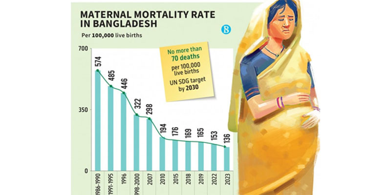 পরিসংখ্যান অনুযায়ী, ১৯৮৬-১৯৯০ সময়কালে প্রতি ১ লাখ জীবিত জন্মে মাতৃমৃত্যুর সংখ্যা ছিল ৫৭৪, যা ১৯৯৮-২০০০ সালে কমে ৩২২-এ নেমে আসে। ২০১০ সালে এই সংখ্যা আরও কমে দাঁড়ায় ১৯৪-এ এবং ২০২৩ সালে তা ১৩৬-এ নেমে আসে। নব্বইয়ের দশকের তুলনায় এটি বড় সাফল্য হলেও, সময়ের সঙ্গে সঙ্গে উন্নতির গতি কমে এসেছে। ১৯৯০-এর দশকে প্রতি ১ লাখ জন্মে মাতৃমৃত্যু কমেছিল ২৫২ জন। পরের দশকে এই হ্রাসের সংখ্যা ছিল ১২৮ জন এবং ২০১০ থেকে ২০২৩ সালের মধ্যে তা আরও সংকুচিত হয়ে মাত্র ৫৮ জনে দাঁড়িয়েছে। উন্নতির এই শ্লথগতির কারণে ২০৩০ সালের মধ্যে প্রতি ১ লাখ জীবিত জন্মে মাতৃমৃত্যুর সংখ্যা ৭০-এ নামিয়ে আনার যে লক্ষ্যমাত্রা জাতিসংঘ নির্ধারণ করেছে, তা অর্জনে বাংলাদেশ ঝুঁকির মুখে পড়েছে। বিশেষজ্ঞরা বলছেন, এই লক্ষ্য অর্জনে দেশকে আরও শক্তিশালী ও ধারাবাহিক পদক্ষেপ নিতে হবে।