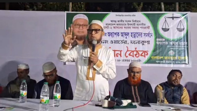 সিলেট জেলা জামায়াতের নায়েবে আমীর, কেন্দ্রীয় মজলিশে শুরা সদস্য ও সিলেট-২ আসনে জামায়াত মনোনীত সংসদ সদস্য পদপ্রার্থী অধ্যাপক আব্দুল হান্নান বলেছেন, মানুষের অধিকার আদায় করতে রাষ্ট্র ক্ষমতায় জামায়াতে ইসলামী দরকার। তাই আগামী জাতীয় নির্বাচনে ন্যায় ও ইনসাফের প্রতিক দাঁড়িপাল্লাকে বিজয়ী করে মানুষের সেই সব অধিকার প্রতিষ্ঠা করতে সহায়তা করুন। তিনি বলেন, আপনাদের ভালবাসা ও সমর্থনে আমি যদি নির্বাচিত হতে পারি তাহলে শান্তি ও সুখময় সমাজ উপহার দিতে চেষ্টা করবো।