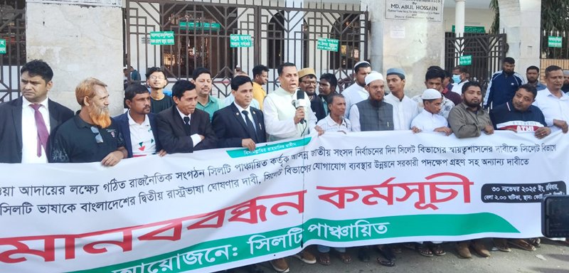 বৃহত্তর সিলেটের সকল ন্যায্য দাবী-দাওয়া বাস্তবায়নের লক্ষ্যে রোববার বেলা ২টায় নগরীর কোর্ট পয়েন্টে সিলটি পাঞ্চায়িতের উদ্যোগে মানববন্ধন কর্মসূচী পালন করা হয়েছে।নির্বাচনের দিন সিলেট বিভাগকে স্বায়ত্তশাসনের দাবীতে গণভোট আয়োজন, সিলটি ভাষাকে বাংলাদেশের দ্বিতীয় রাষ্ট্রভাষা ঘোষণা, সিলেটের যোগাযোগ ব্যবস্থার উন্নয়নে সরকারী পদক্ষেণ গ্রহণসহ বিভিন্ন দাবীতে এই মানববন্ধন কর্মসূচী পালন করা হয়।