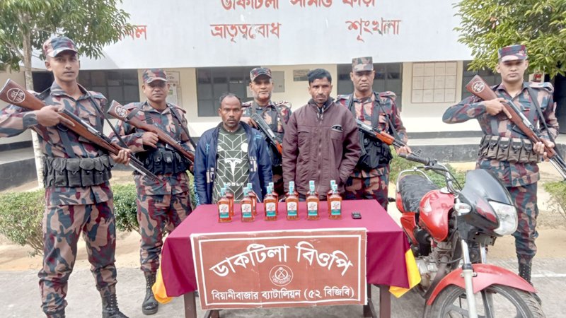 বিজিবি জানায়, সীমান্ত হতে ২০০ গজ বাংলাদেশের অভ্যন্তরে টহলকালে ৩ জন মোটরসাইকেল আরোহীকে থামতে বললে এক জন দৌড়ে পালিয়ে গেলে সন্দেহভাজন দুইজনকে আটক করতে সক্ষম হয়। তাদের দেহ তল্লাশী করলে ১২ বোতল অবৈধ মদ পাওয়া যায়। আটককৃতরা হল- উপজেলার ফুলতলা ইউনিয়নের ৬নং ধলাই হাওর গ্রামের হরিনারায়ন যাদব এর পুত্র জতন যাদব (৩৮) ও ১১নং এলবিনটিলা গ্রামের নকুল বুনার্জীর পুত্র সন্তোষ বুনার্জী (৩৩)।