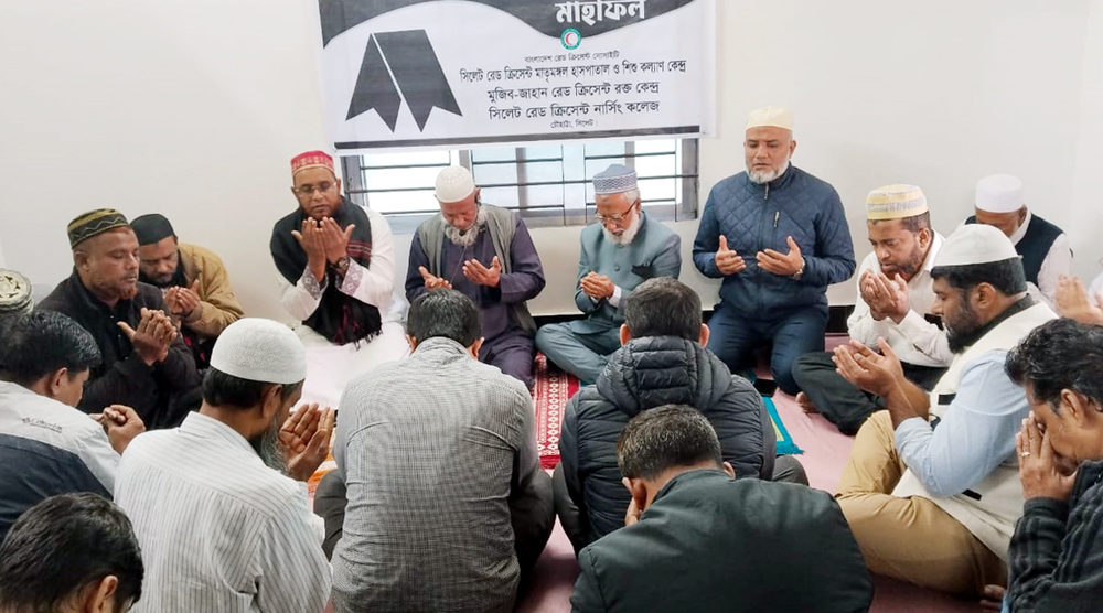 বৃহস্পতিবার সকালে বাংলাদেশ রেড ক্রিসেন্ট সোসাইটি সিলেট ইউনিটের অধিভুক্ত রেড ক্রিসেন্ট মাতৃমঙ্গল হাসপাতাল ও শিশু কল্যাণ কেন্দ্র, মুজিব জাহান রক্তকেন্দ্র এবং রেড ক্রিসেন্ট নার্সিং কলেজের উদ্যোগে এই দোয়া মাহফিল অনুষ্ঠিত হয়। দোয়া মাহফিলে প্রধান অতিথি হিসেবে উপস্থিত ছিলেন বাংলাদেশ রেড ক্রিসেন্ট সোসাইটি সিলেট ইউনিটের সেক্রেটারি মাহবুবুল হক চৌধুরী।