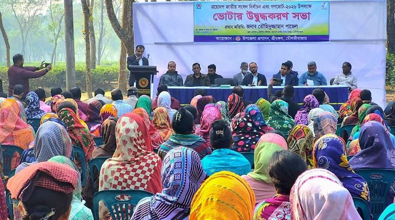 শ্রীমঙ্গল প্রতিনিধি: মৌলভীবাজারের শ্রীমঙ্গলে আসন্ন ত্রয়োদশ জাতীয় সংসদ নির্বাচন ও গণভোট-২০২৬ উপলক্ষে চা শ্রমিকদের নিয়ে ভোটার উদ্বুদ্ধকরণ সভা অনুষ্ঠিত হয়েছে। শনিবার সকাল সাড়ে ৯টায় শ্রীমঙ্গল উপজেলার কালিঘাট ইউনিয়নের ফুলছড়া চা বাগান মাঠে উপজেলা প্রশাসনের আয়োজনে এ সভা অনুষ্ঠিত হয়। আয়োজিত সভায় প্রধান অতিথি হিসেবে বক্তব্য দেন, মৌলভীবাজারের জেলা প্রশাসক ও রিটার্নিং অফিসার তৌহিদুজ্জামান পাভেল।