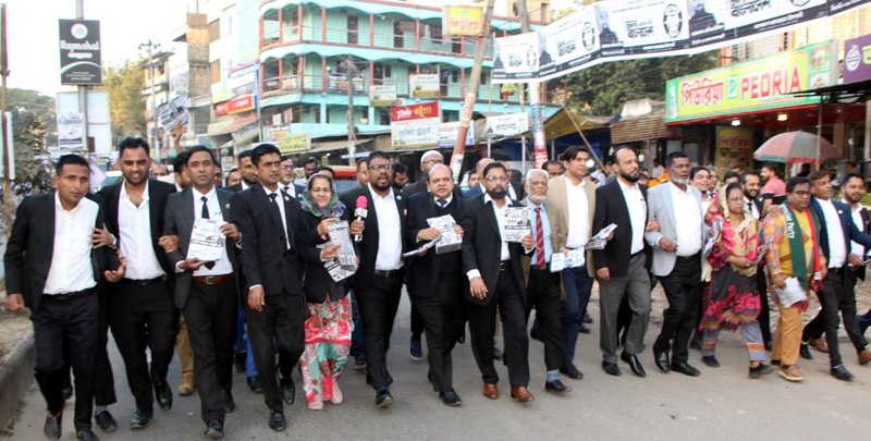 ধানের শীষের প্রার্থী সিলেট-১ আসনে খন্দকার আব্দুল মুক্তাদির ও ৬ আসনে এমরান আহমদ চৌধুরীর সমর্থনে বাংলাদেশ জাতীয়তাবাদী আইনজীবী ফোরাম সিলেটের উদ্যোগে প্রচার মিছিল ও লিফলেট বিতরণ করা হয়েছে।