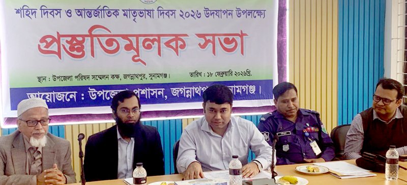 বুধবার সকাল ১১ টায় উপজেলা পরিষদ সম্মেলনকক্ষে উপজেলা নির্বাহী অফিসার মো. বরকত উল্লাহর সভাপতিত্বে এ প্রস্তুতি সভা অনুষ্ঠিত হয়। প্রস্তুতি সভায় উপজেলা সহকারী কমিশনার (ভূমি) মো. মহসীন উদ্দীন, উপজেলা বিএনপির আহ্বায়ক মো. আবু হোরায়রা সাদ মাষ্টার, অফিসার ইনচার্জ মো. সফিকুল ইসলাম, উপজেলা প্রকৌশলী সোহরাব হোসেন, উপজেলা প্রাণিসম্পদ কর্মকর্তা ডা. খালেদ সাইফুল্লাহ, উপজেলা সমবায় অফিসার রাজ মনি সিংহ, জগন্নাথপুর ইউপিইটিসি ইন্সট্রাক্টর মো. মোস্তফা আহসান হাবিব, সহকারী প্রাথমিক শিক্ষা অফিসার মামুনুর রহমান হাওলাদার, উপজেলা একাডেমিক সুপারভাইজার অরূপ কুমার রায়, পল্লী সঞ্চয় ব্যাংক জগন্নাথপুর শাখা ব্যবস্থাপক মো. আব্দুল হাকিম, জগন্নাথপুর মডেল মসজিদের পেশ ইমাম মাওলানা জুবায়ের আহমদ, জগন্নাথপুর সাংবাদিক ফোরামের সভাপতি মো. হুমায়ুন কবির, কার্যনির্বাহী কমিটির সদস্য রিয়াজ রহমান, সাংবাদিক শাহজাহান মিয়া, ইকবাল হোসাইন, শাহ ফুজায়েল আহমদ, কাঞ্চনশিখা একাডেমির পরিচালক কুশোল কান্তি রায় সহ উপজেলা বিভিন্ন দপ্তরের কর্মকর্তাবৃন্দ উপস্থিত ছিলেন। প্রস্তুতি সভায় আন্তর্জাতিক মাতৃভাষা দিবস যথাযোগ্য মর্যাদা ও ভাবগাম্ভীর্যের সাথে পালনের জন্য সকল দপ্তরের কর্মকর্তাদের বিভিন্ন দিকনির্দেশনা প্রদান করেন উপজেলা নির্বাহী কর্মকর্তা।